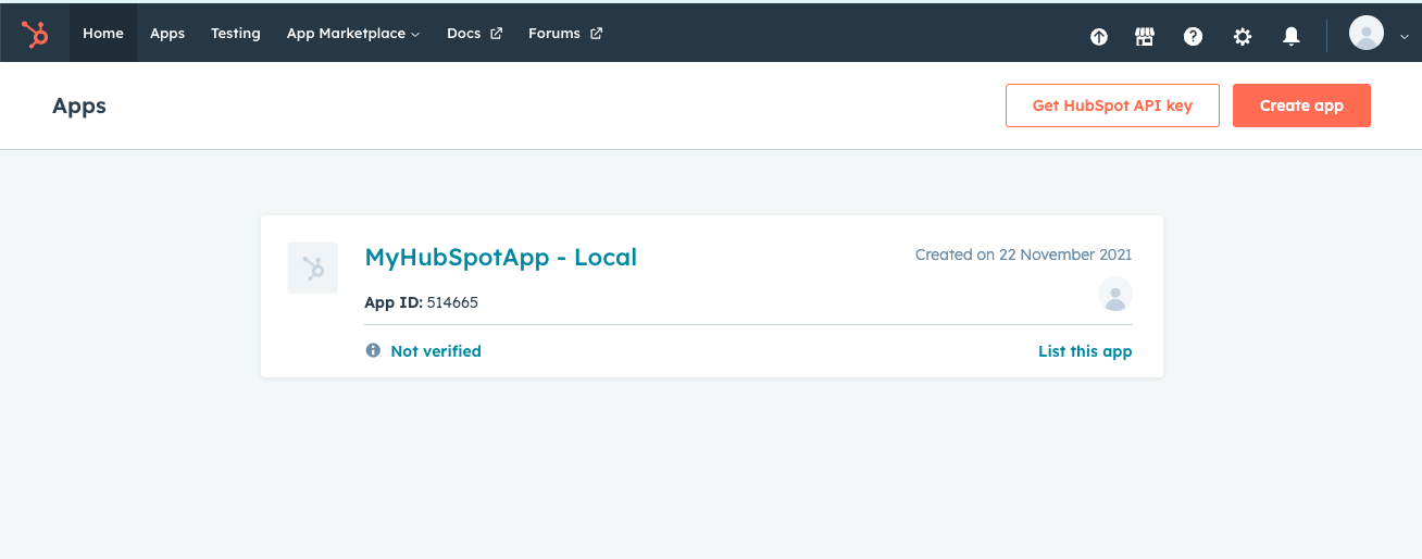 Log in with your Hubspot Developer account and go to the "Apps" page from the top navigation.